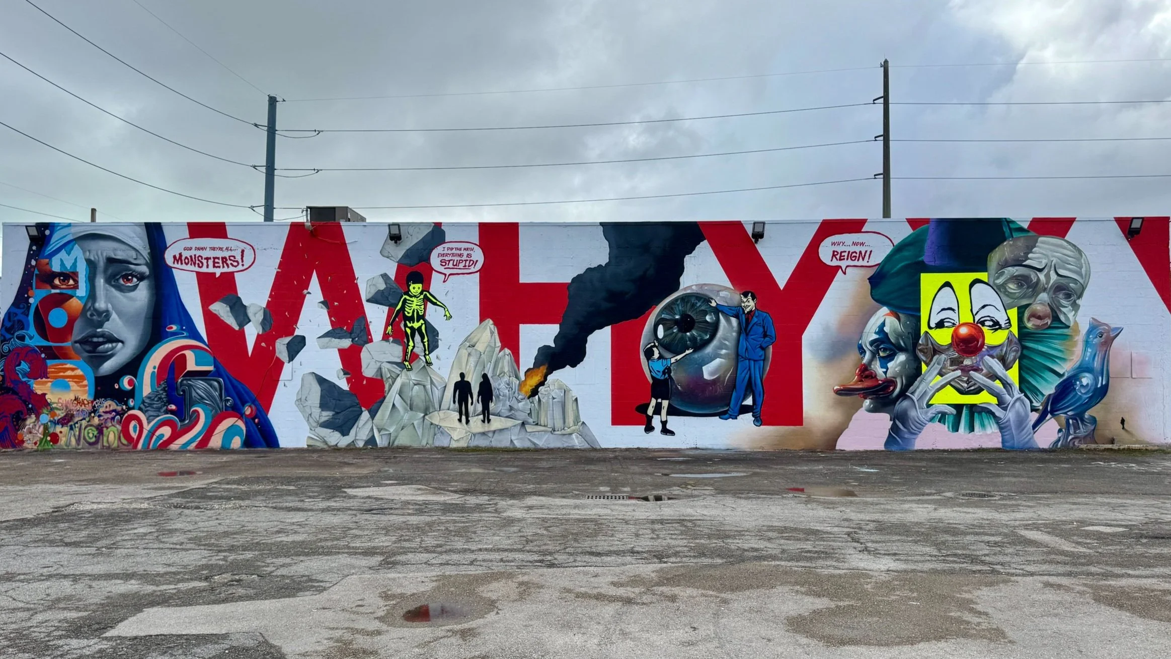 Large mural of two faces, one of a woman with long hair surrounded by octopus tentacles by Jeks, the other of a glass woman with closed eyes and floral elements, on a building wall of Butterfield and Vallis in Hamilton Bermuda